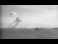 Naval Photographic Center film #1174 description 1 SCU Church services on AP, Chaplain-7V. 2 LS From LC, Smoke col. rises on Is.3 MS LCs approach, pass, BB firing. 4 LS Form. planes pass, over. DD underway. 5 CU Camouf. Marine & N.G., in LC. 6 LS LCs underway. CU Camouf. Marines-hazy. 7 LS DD firing, many LCs FG. 8 GV Pan LCs approach, LS Smoke col. on Is., LCs FG. 9 LS Planes bomb Is., smoke rises. 10 LS DD, MS Pan LCMs. Marines run forward. 11 S Long row Japanese bodies in trench. Wreckage. 12 CU 2 Japanese dead in dugout-2V. 13 MS Carouf. Marines with duck. 14 GV Bulldozer digs Japanese from dugout--Good. 15 MS Marines throw grensdes in Japanese dugout. 16 MS 1st Aviator to land on ls. F6F strip.17 GV CB truck tows roller on strip pairs